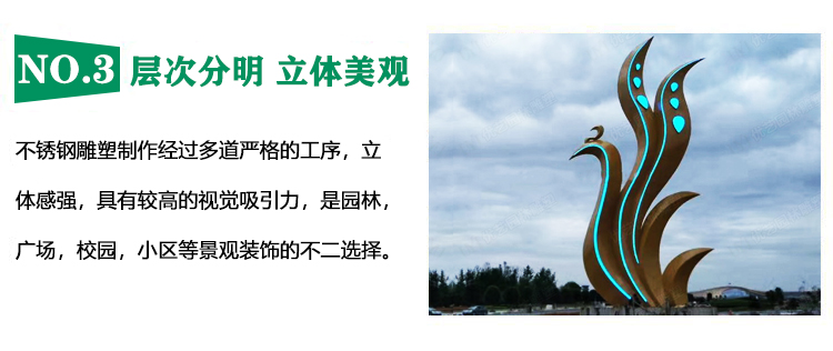 不銹鋼雕塑的價格需要根據產品的形狀、尺寸來定,造型空間感越強,細節表達得越多,雕刻難度越大,雕刻師傅花的心思和時間越多,這樣成本就越高,價格也就會隨之增高。